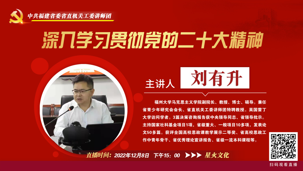 为深入学习宣传贯彻党的二十大精神,持续掀起学习热潮,2022年12月8日下午,永利集团官网入口组织全体党员干部观看省直机关工委讲师团特聘教授、福州大学马克思主义学院副院长刘有升教授的《高举旗帜的政治宣言,伟大复兴的行动纲领——深入学习贯彻党的二十大精神》线上专题讲座。