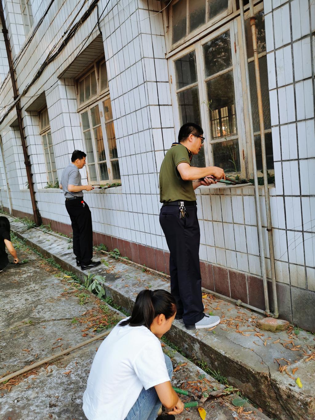 支部党员分工合作,埋头苦干,拿起花木修剪大剪刀,细心地清理枯枝杂草,整理花园植被,清除垃圾杂物,砖缝里、窗户边、阶梯旁,不落下每一个死角,发挥不怕脏、不怕累的精神,身体力行地参与美丽校园建设工作。