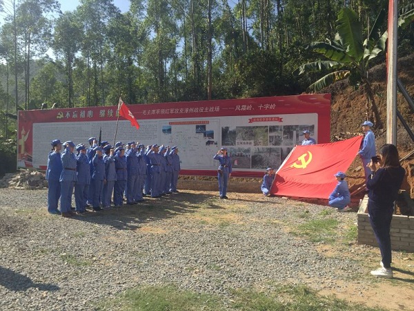 活动中,两支部全体党员身着红军装、手举红军旗,重走了一遍当年中国工农红军攻克漳州时走过的山路,瞻仰了红军作战指挥所、红军树,参观了十字岭、风霜岭战斗遗址,回顾了85年前漳州战役的峥嵘岁月,感受了老一辈无产阶级革命家不畏艰险、奋不顾身为中国革命胜利作出的不朽贡献,加深了对党的十九大精神的理解和认识。在红军作战指挥所旁,两支部党员还面对党旗进行了庄严的宣誓仪式,重温了入党誓词。在校党委组织部部长、党办校办党支部书记陈超的领誓下,洪亮而整齐的入党誓词在山谷回荡,深刻表达了支部党员对革命先烈的崇高敬意和深切怀念。