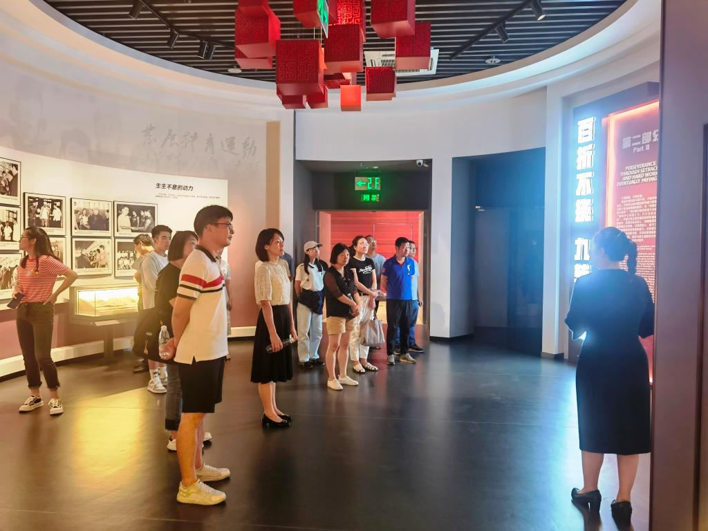 在解说员的讲解引导下,全体人员依次参观了展示馆三大展厅,沉浸式体验了中国女排从漳州走向世界,登上巅峰,后趋于沉寂,又再创辉煌的奋斗历程。参观同志被现场展品和感人事迹深深吸引,也被女排矢志不渝的奋斗精神所激励。