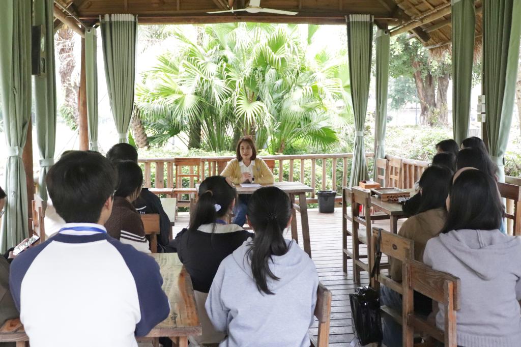 在龙海区双第华侨农场的户外简棚,学生处党支部副书记陈佳薇以“传承中华民族精神,铸牢共同体意识”为主题,为学生干部代表讲授党课。她从华侨女英雄李林烈士的事迹引出抗战精神,谈到民族精神是一个民族生生不息、团结奋进的重要支撑,解读了铸牢中华民族共同体的内涵、意义和实践要求。她指出,铸牢中华民族共同体意识,是维系中华民族团结统一、维护国家统一的思想基础,是推动中华民族发展进步的强大精神动力,是中华儿女共同的责任和使命。她要求,学生党员、学生干部要带头学习贯彻习近平总书记关于加强和改进民族工作的重要思想,发挥先锋模范作用,带动身边的同学为各民族团结进步贡献自己的力量。