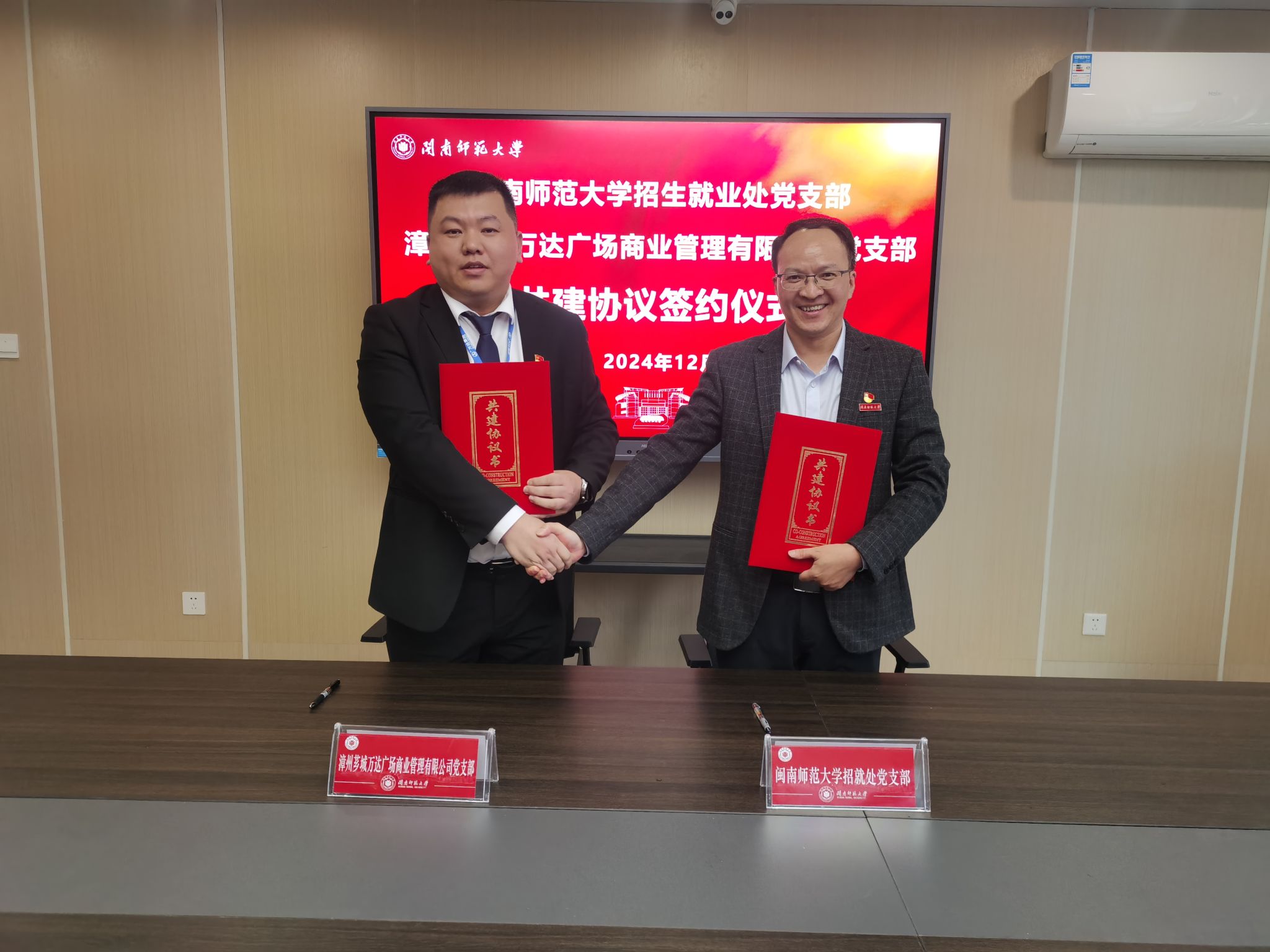 12月12日,招就处党支部与漳州芗城万达广场商业管理有限公司党支部共建签约仪式在科技楼北1209会议室举行。双方支部全体党员出席活动。