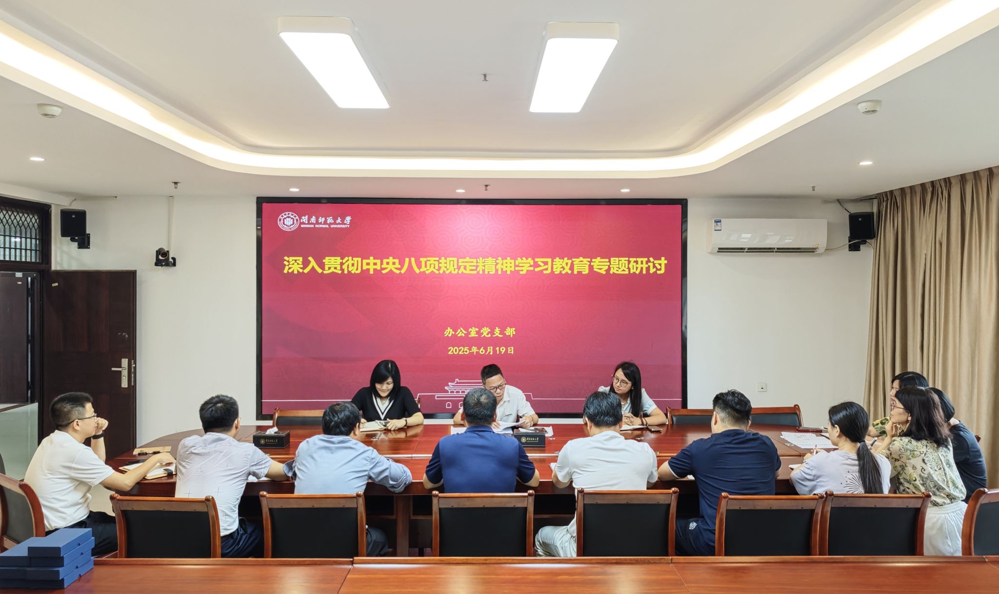 6月19日,办公室党支部在科信楼1507会议室开展深入贯彻中央八项规定精神学习教育专题党课学习与交流研讨,学习会由支部书记罗炎成主持,特邀校民盟代表詹慧琴老师一同参加。